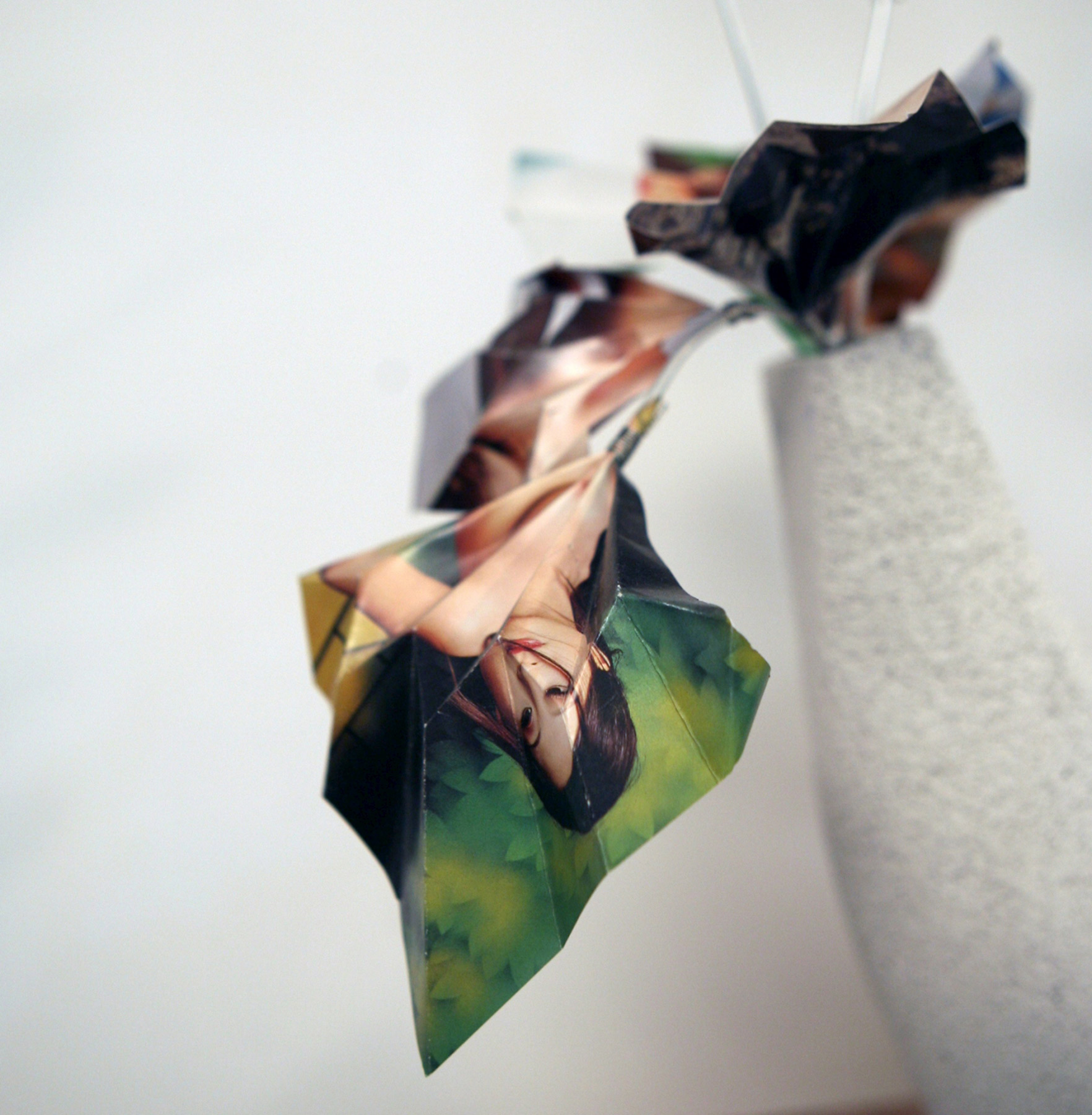 The origami flowers, made from pages from a Chinese magazine, hold within them photographs of nude women in idyllic landscapes that are clearly taken in the studio. In a country where pornography is banned, the magazine is marketed for art, but the style of the photographs suggest that the reader is more erotically than aesthetically interested. Voet literally, and metaphorically, folds together different forms of artificial beauty. As part of an on-going series, the flowers stand in vases based on traditional forms, but carved from the base material of cinderblock.