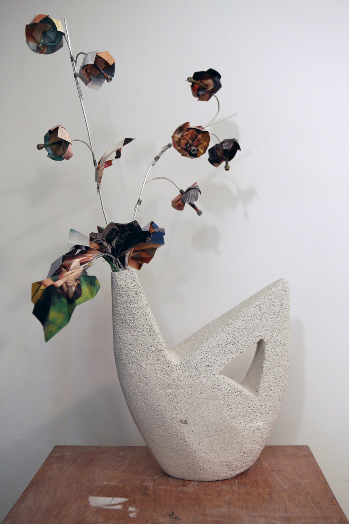 The origami flowers, made from pages from a Chinese magazine, hold within them photographs of nude women in idyllic landscapes that are clearly taken in the studio. In a country where pornography is banned, the magazine is marketed for art, but the style of the photographs suggest that the reader is more erotically than aesthetically interested. Voet literally, and metaphorically, folds together different forms of artificial beauty. As part of an on-going series, the flowers stand in vases based on traditional forms, but carved from the base material of cinderblock.